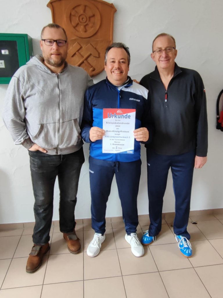 Unser zweites Team mit der Urkunde für den zweiten Platz in der 1. Kreisklasse; von links: Stephan Heimroth, Cristian Sutianu und Edwin Kaiser.