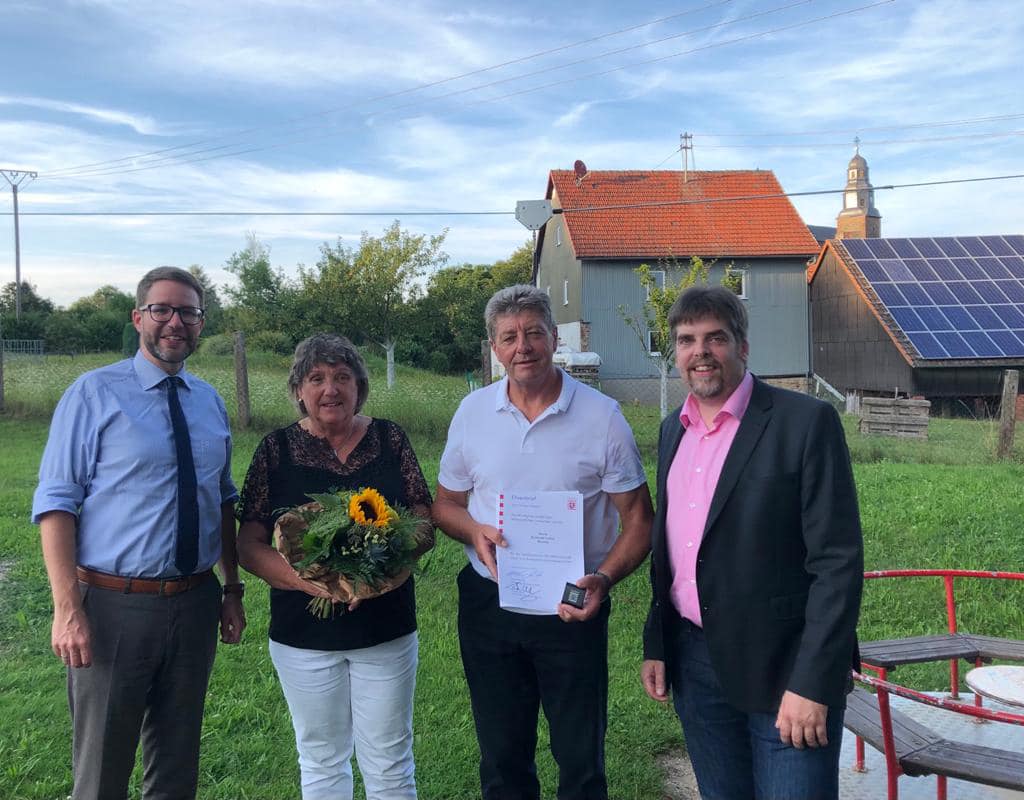 Landrat Thorsten Stolz überreichte für sein langjähriges ehrenamtliches Engagement den Ehrenbrief des Landes Hessen. Anwesend waren der 1. Beigeordnete Christian Götz, Altbürgermeister Wolfgang Gottlieb sowie Ortsvorsteher Edmund Schenk. Ausserdem Abordnungen des Kirchenvorstandes der Kirchengemeinde Unterreichenbach, der Freiwilligen Feuerwehr, Gesangverein Eintracht Unterreichenbach und den Dalles Kickern. Sichtlich bewegt nahm Reinhold Lofink die Auszeichnung entgegen und bedankte sich bei allen Anwesenden, sowie seiner Familie, ganz besonders seiner Frau Hannelore.
