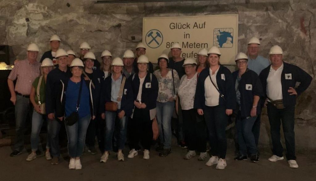 Am Samstag, dem 2.9.23 absolvierten 25 Vereinsmitglieder und deren Angehörige einen interessanten und erlebnisreichen Ausflug und fuhren mit einem örtlichen Busunternehmer in die westthüringische Krayenberggemeinde im Wartburgkreis in der Rhön in das dortige Schaubergwerk im Ortsteil Merkers, wo 1993 der Betrieb eingestellt wurde. Nach einer kurzen Einführung über Tage ging es mit einem Förderkorb in ca. 90 Sekunden bis auf 500 Meter Tiefe. Dort stiegen wir in einen Mannschaftswagen und begannen eine 21 Kilometer lange Rundfahrt, die riesigen Spaß machte, da unser Fahrer Gerd meist mit ca. 30-35 km/h durch die langen unterirdischen Gänge und vielen Kurven sowie Gefällstrecken „durchraste“. Unterwegs erfuhren wir Einzelheiten über den Kalisalzabbau und besuchten den Lagerort des sogenannten „Nazigoldes“; außerdem das Salzbergbaumuseum und in 800 m Tiefe eine Kristallhöhle mit Salzkristallen bis zu einem Meter Kantenlänge und einer „Kristallbar“, wo es kühle Getränke gab. Weiterhin faszinierte uns eine Lasershow im ehemaligen Großbunker, dem größten und tiefsten Konzertsaal der Welt – Maße: 250 m lang, 22 m breit und bis zu 17m hoch – der eine sehr gute Akustik hat und in dem regelmäßig vor maximal 1400 Zuschauern klassische Konzerte und auch Rockkonzerte stattfinden, die meist ausverkauft sind. Nachdem wir nach ca. drei Stunden aus der Tiefe wieder über Tage angekommen waren, fuhren wir nach Dipperz, „das Tor zur Rhön“, in das dortige Grillrestaurant „Kneshecke“, um uns bei leckeren Grillspezialitäten und kühlen Getränken nach der erlebnisreichen Schaubergwerktour zu stärken. Gegen 22 Uhr traten wir die Rückreise nach Unterreichenbach an; es ging damit ein erlebnisreicher Tag zu Ende. Hier an dieser Stelle sagen wir vielen Dank an unsere Vereinsmitglieder Elena Franzke und Rebecca Muth, die diesen tollen Tag hervorragend organisiert hatten.