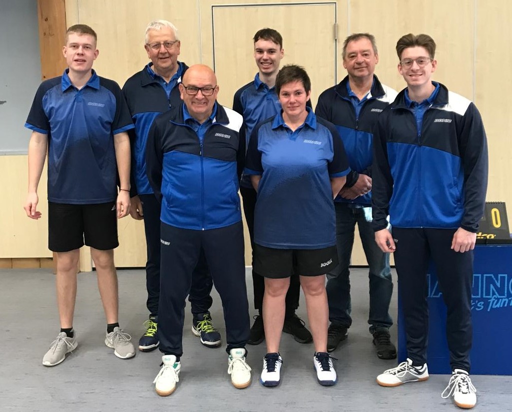 Foto unserer 1. Herrenmannschaft, die in der vergangenen TT-Saison 2024/2025 in dieser Aufstellung in der Bezirksklasse Gruppe 11 spielte